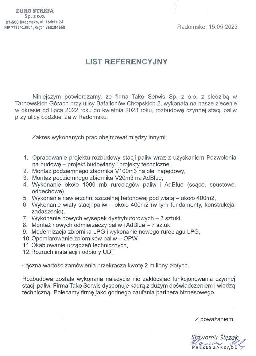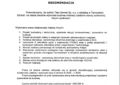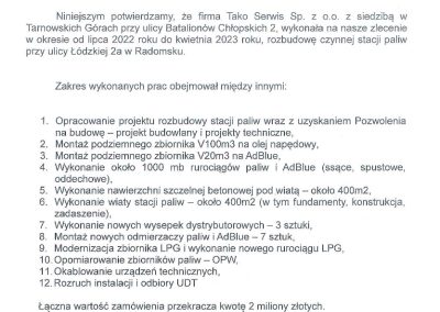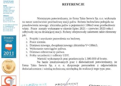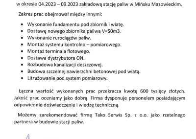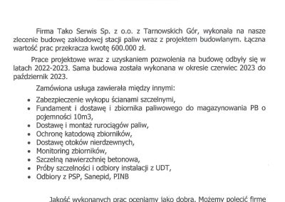 Inwestycja: Rozbudowa czynnej stacji paliw o zbiornik V100m3 do magazynowania oleju napędowego oraz zbiornik V20m3 do magazynowania AdBlue